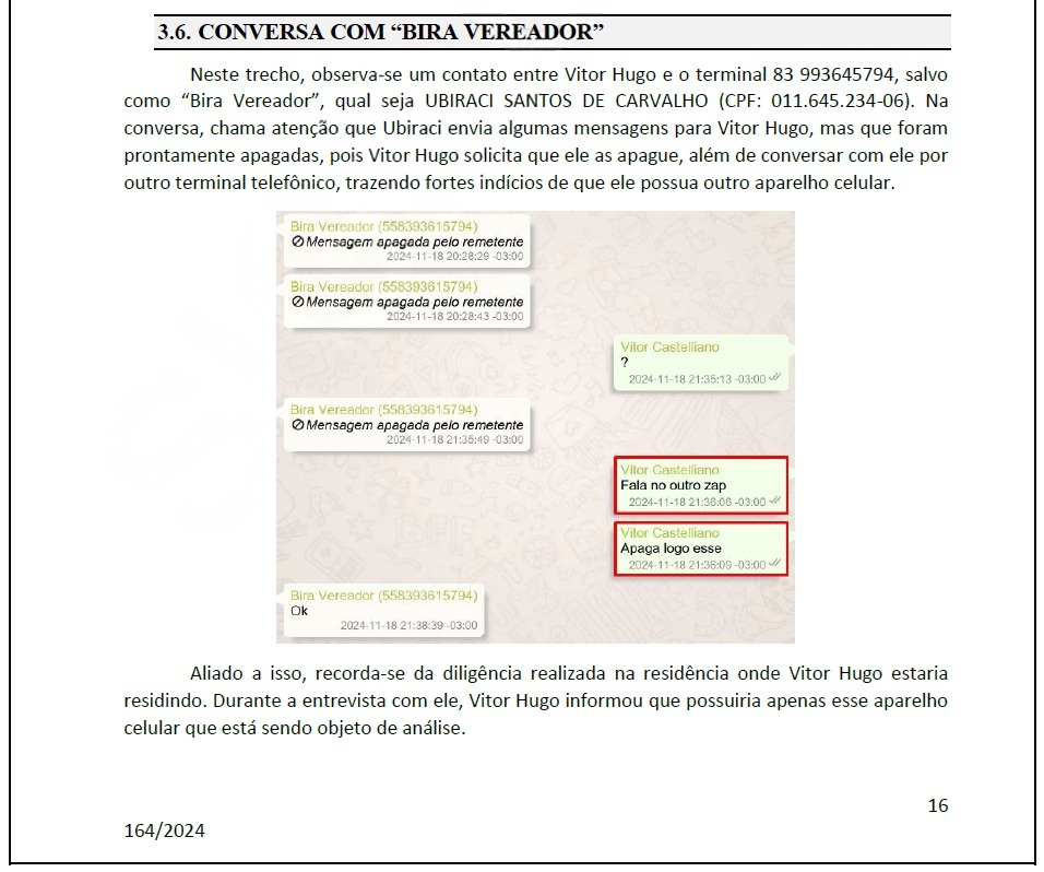 Em um dos relatórios, há registro de uma troca de mensagens entre Bira e o ex-prefeito Vitor Hugo Castelliano. Parte do conteúdo foi apagado, e Vitor Hugo teria instruído o interlocutor a “falar no outro zap” e “apagar logo esse”, sugerindo o uso de um segundo canal de comunicação. Para os investigadores, esse trecho levanta suspeitas sobre a existência de conversas paralelas não incluídas nos autos.