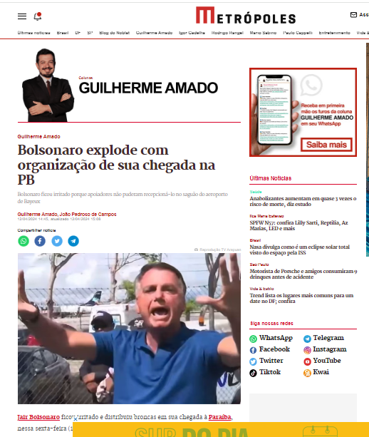 Os portais Estado de Minas e Metrópoles foram alguns veículos de repercussão nacional que repercutiram, na tarde desta sexta-feira (12), a bronca do ex-presidente Jair Bolsonaro (PL) com os apoiadores na Paraíba.