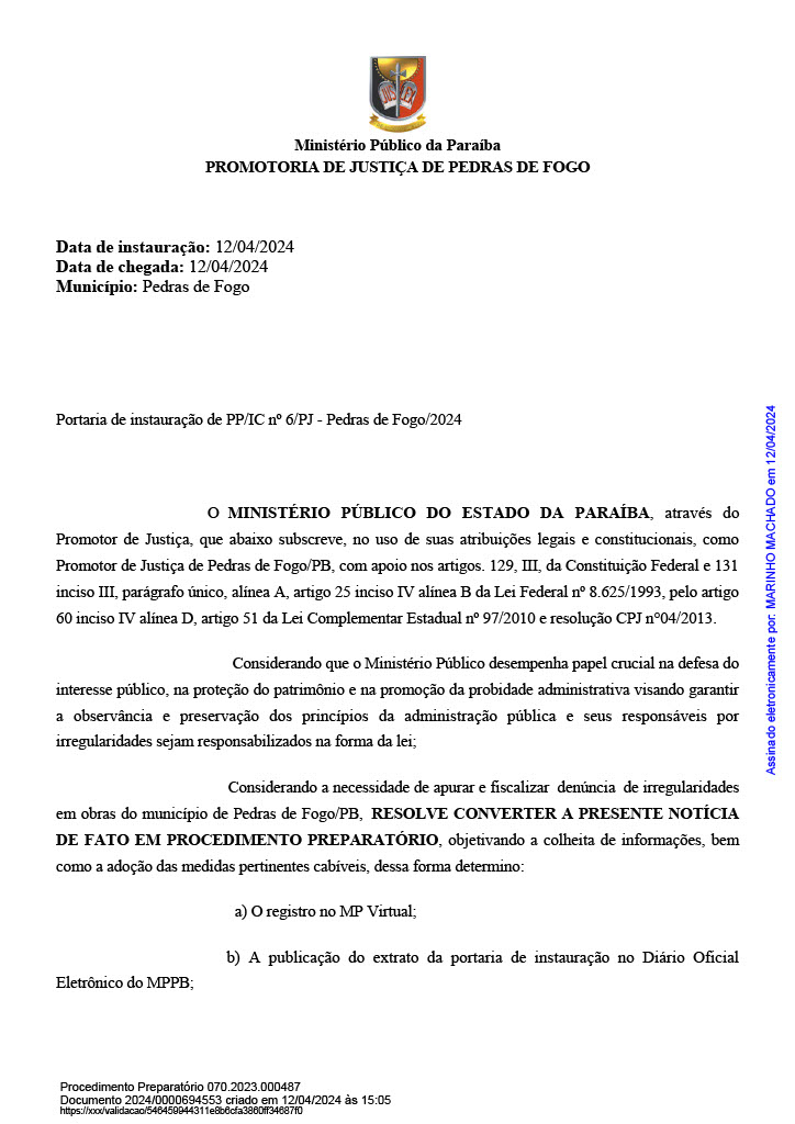 O promotor de Justiça Antônio Barros Pontes Neto determinou a instauração do Procedimento Preparatório nº 070.2023.000487 para apurar possíveis irregularidades relacionadas a obras paralisadas na cidade de Pedras de Fogo, na Grande João Pessoa.