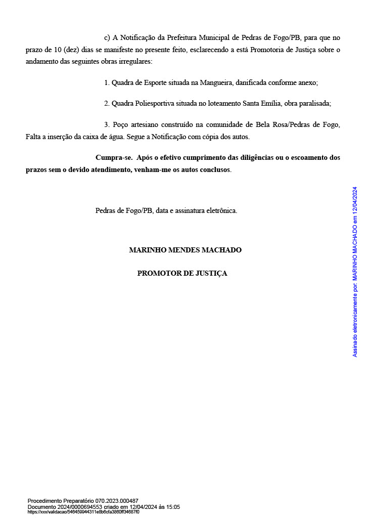 De acordo com o documento, a Prefeitura de Pedras de Fogo tem um prazo de 10 dias para esclarecer ao Ministério Público sobre o andamento das seguintes obras: a quadra de esportes situada na Mangueira, que está danificada; a quadra poliesportiva no loteamento Santa Emília, atualmente paralisada; e um poço artesiano na comunidade de Bela Rosa, cuja construção está incompleta, faltando a instalação da caixa d’água.