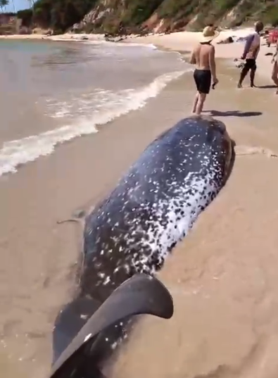 Em um vídeo feito por populares e enviado ao PB Agora é possível ver a baleia encalhada.